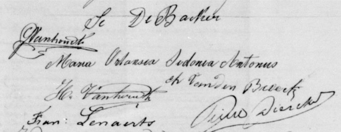getuigen : franciscus Debakker kozijn van bruidegom 44 jaar en Henricus Van Houdt 26 jaar broer van bruidegom, Franciscus Lenaerts kozijn van de bruidegom wonende in Westerlo. Handtekening van bruid en bruidegom : gerardus en Maria Antonus